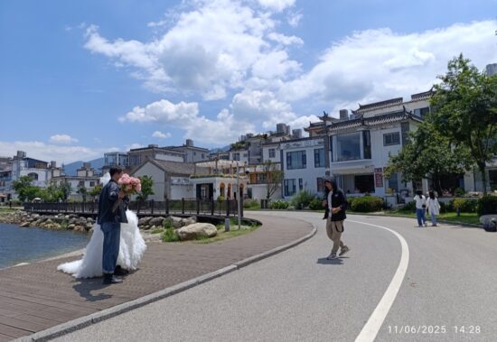 我们每天要拍30多对新人。” 不远处,白族老人李菊英坐在廊道长椅上,望着湖面上嬉戏的紫水鸡和赤麻鸭,脸上浮现出安宁的笑容。