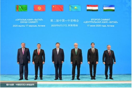 和平日报, 2025年6月20日,(综合报道):   6月17日下午,第二届中国—中亚峰会在阿斯塔纳独立宫举行。哈萨克斯坦总统托卡耶夫主持会议。中国国家主席习近平、吉尔吉斯斯坦总统扎帕罗夫、塔吉克斯坦总统拉赫蒙、土库曼斯坦总统别尔德穆哈梅多夫、乌兹别克斯坦总统米尔济约耶夫出席。元首们在友好气氛中共同回顾西安峰会以来中国—中亚各领域合作成果,展望未来发展方向,一致决定弘扬“中国—中亚精神”,坚持永久睦邻友好,携手推动中国—中亚命运共同体建设不断取得新成就。