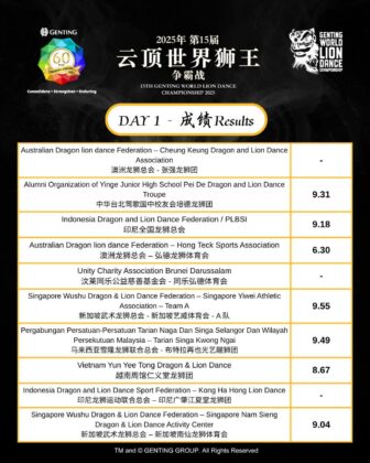 2025年“第15届云顶世界狮王争霸战”历经3天激烈角逐,狮王终诞生。新加坡武术龙狮总会-新加坡艺威体育会B队以“艺胆雄威”为主题,呈献18个高难度动作,招式流畅利落,技艺精湛,再度技压群雄,以9.78高分成功卫冕,不仅蝉联冠军,更超越上届9.73分的成绩,为该狮团写下二连冠的辉煌纪录。
