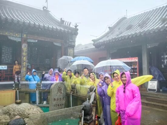 经过数小时的攀登,团队终于抵达位于泰山上的孔子庙。雨水沿着庙宇的飞檐流下,如同天地为这庄严时刻垂下的珠帘。