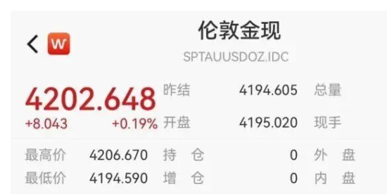 北京时间11月13日早,现货黄金升破4200美元/盎司。截至记者发稿,现货黄金报4202.648美元/盎司,日内涨0.19%。