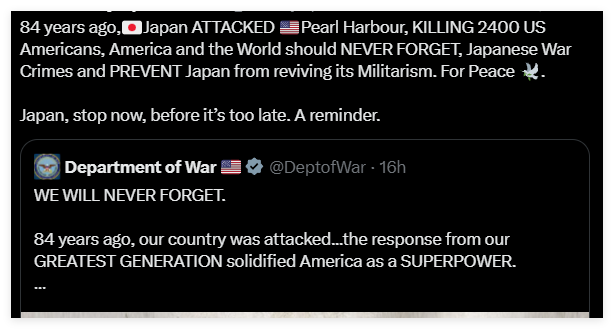 和平日报, 2025年12月11日, 据环球时报报道,北京时间12月7日晚10时,美国国防部在其官方社交账号发布了一则纪念美国珍珠港遇袭84周年的纪念海报,并配文:我们永远不会忘记!