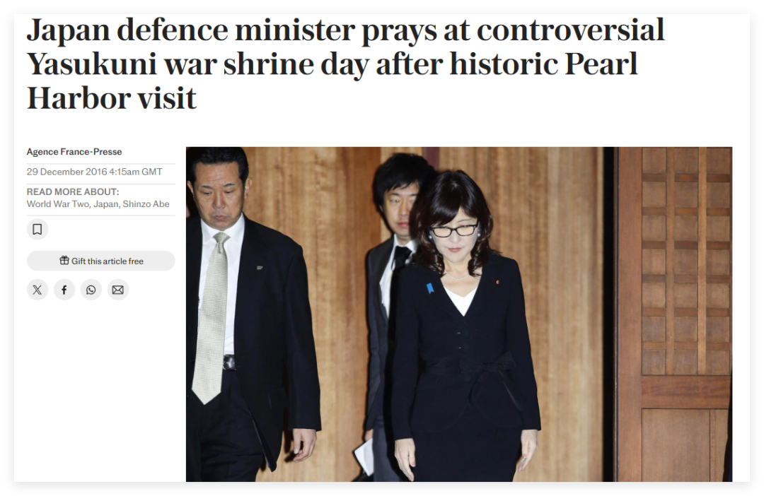 但是,美国政府也不应该忘记,在过去这些年里,包括现任日本首相在内的一些日本高官,都曾参拜过供奉有二战甲级战犯的靖国神社。比如,日本前首相安倍——现任首相高市早苗的政治导师,除了公然参拜过靖国神社,还在2014年在巴布亚新几内亚,向供奉着珍珠港袭击的策划者山本五十六的石碑献过花;而2016年时,才从珍珠港回来的时任日本防卫大臣稻田朋美转头就参拜了靖国神社。