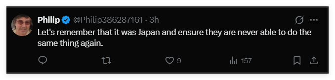 曾在中国教过书的美国材料学教授 Philip Nash,更是在他的账号上写道:“我们要铭记这一切的始作俑者是日本,并且要确保他们再也无法重蹈覆辙。”