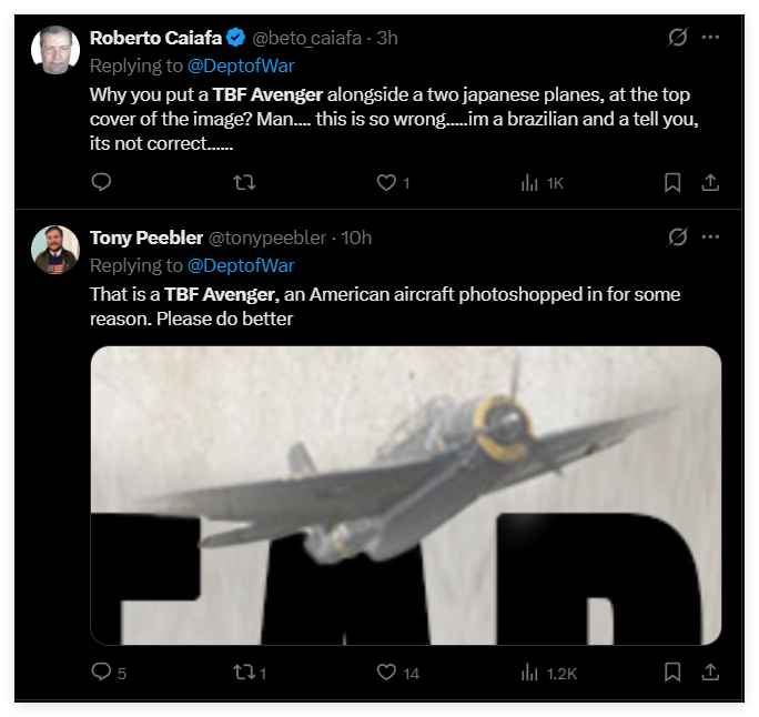 而除了被遗漏掉的袭击珍珠港的凶手信息外,美国国防部的这则纪念海报,还被美国及海外军事爱好者发现了另一个尴尬的问题:海报中三架正在对珍珠港发动袭击的敌机中,居然有一架是美国自己的TBF轰炸机。