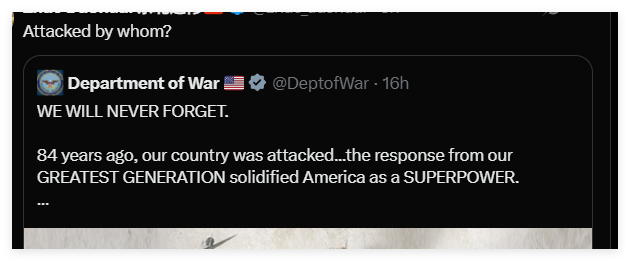 北京时间12月7日晚10时,已经改名为“战争部”的美国国防部,在其官方社交账号发布了一则纪念美国珍珠港遇袭84周年的纪念海报,并配文:我们永远不会忘记!