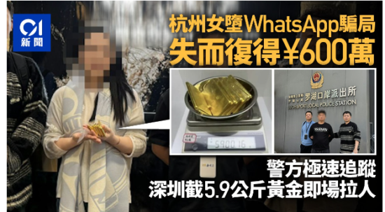 和平日报, 2026年2月9日, 杭州一名女子近日身陷WhatsApp钓鱼讯息骗局,将600万元(人民币,下同)转帐至骗徒户口。当地警方紧急联络多地,成功在转帐后短时间内在深圳拦截已被用于购买黄金的涉案资金,并拘捕疑犯,为该女子全额挽回了损失。
