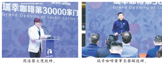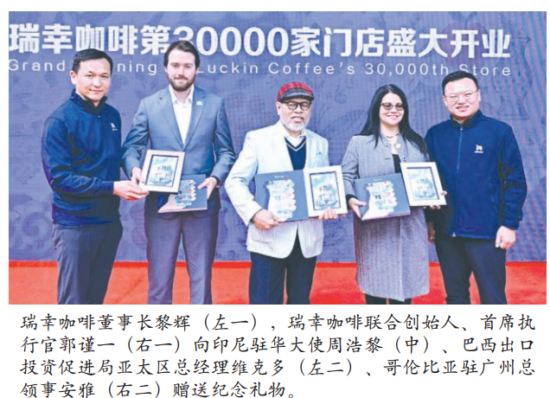 和平日报, 2026年2月12日,【中国深圳讯】2026年 2月8日(星期日)印度 尼西亚驻华大使周浩黎与 瑞幸咖啡董事长黎辉及瑞 幸咖啡中国联合创始人及 总裁郭谨一 共同出席为 瑞幸咖啡在中国大都市深 圳开设的第3万家门店揭 幕仪式。 印度尼西亚驻华大使 出席此次开幕仪式,标志 着印尼与瑞幸咖啡之间日 益紧密的合作伙伴关系。